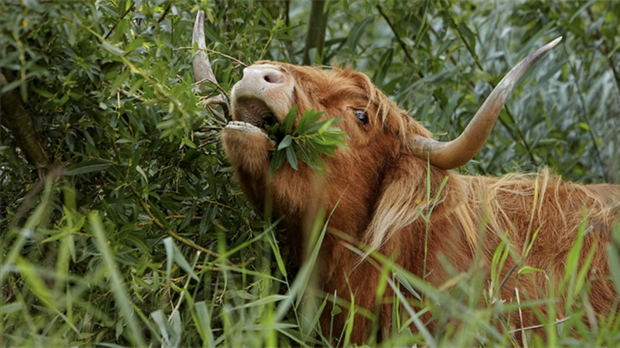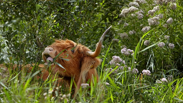 Verspreid over het Bos staan verschillende kuddes grote grazers voor begrazing, zowel Schotse hooglanders als ...