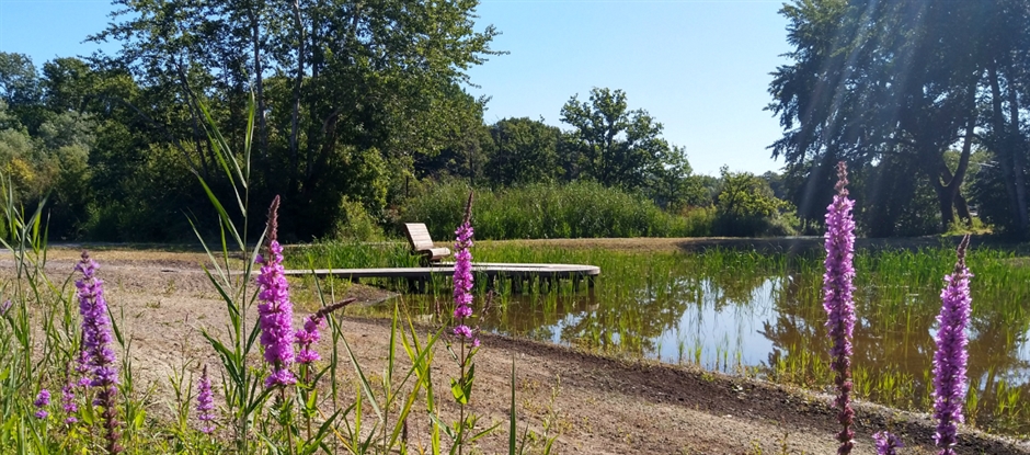 - 5. Heringerichte oever van het Nieuwe Meer waarbij grond is gebruikt die is vrijgekomen uit de poelen en aanleg van een steiger met zitbank. Honden zijn hier niet toegestaan.: