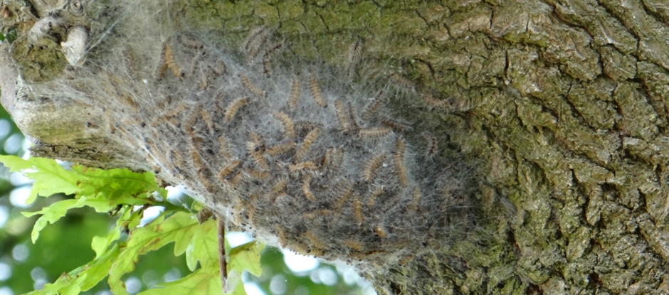 De bolvormige nesten hangen meestal aan de onderkant of in de 'oksels' van de takken, maar kunnen ook op de stam voorkomen. Ziet u (nieuwe) nesten van de eikenprocessierups? Meld dit dan. U kunt ook 14 020 bellen.