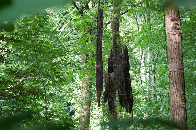 Zacht knapperend, poppend en ruisend klinken er geluiden die lijken te komen uit de dikke plakken schors die rustig wiegen in de lucht. Het sculpturale geluidswerk The bark decided to act on its own 2.0 van kunstenaar Ronald van der Meijs verleidt de voorbijganger om stil te staan bij de onzichtbare maar essentiële levensaderen van een boom. Hoe kan de mens berusting vinden in de wispelturigheid van de natuur?
